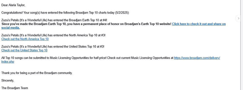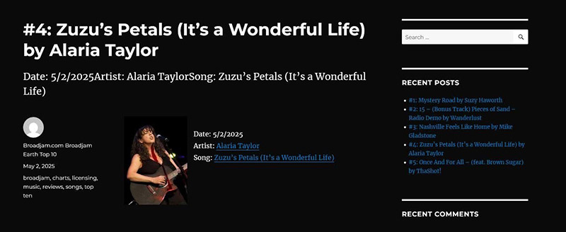 Alaria’s original song "Zuzu's Petals (It's a Wonderful Life)" just entered the Broadjam Earth Top 10 at #4, the North American Top 10 at #3, Wisconsin Top 10 at #2, United States Top 10 at #3, Unique Top 10 at #1, and Unique Holiday Top 10 at #1! Making the Broadjam Earth Top 10 earned Alaria a permanent place of honor on Broadjam’s Earth Top 10 website. |