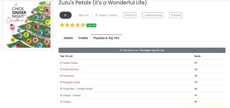 Alaria's song "Zuzu's Petals (It's a Wonderful Life)" is #9 on Broadjam's Wisconsin Top 10 chart, and #2 in the nation on Broadjam's Unique Holiday chart. |